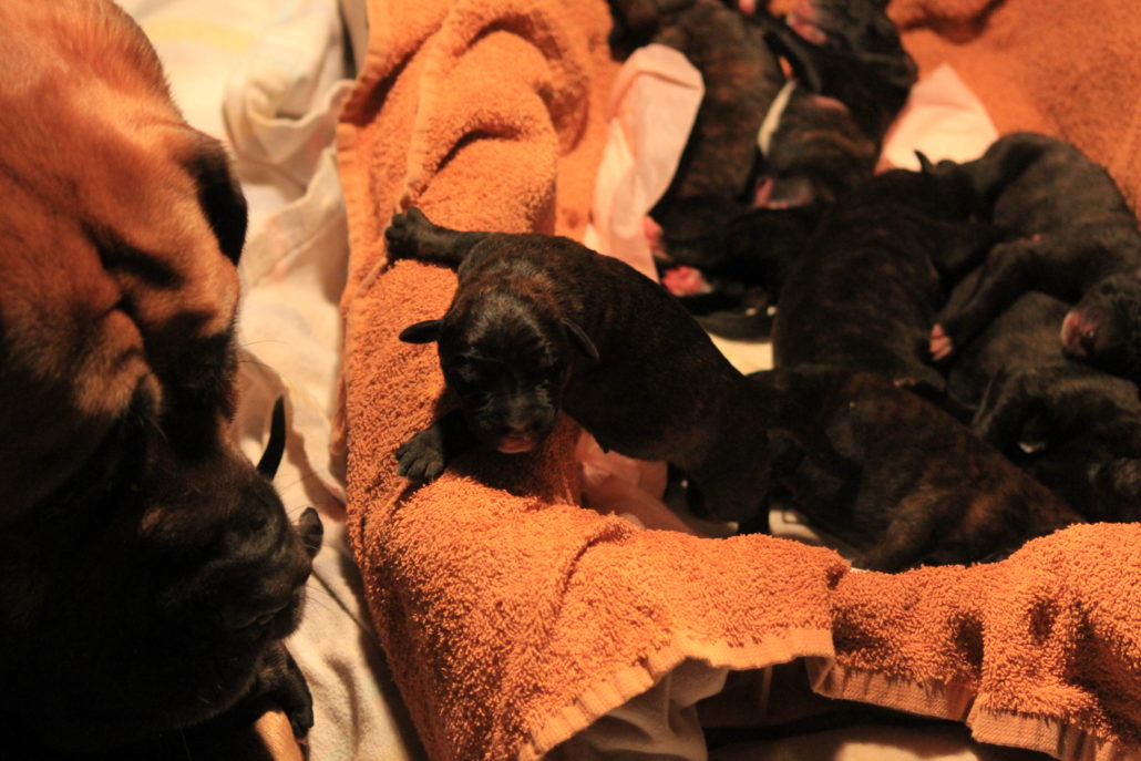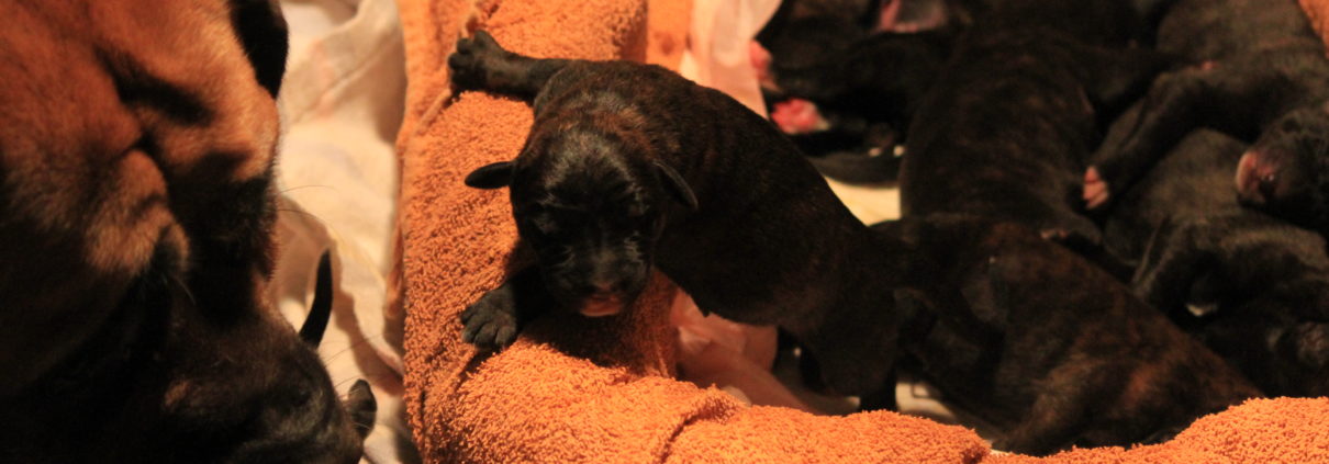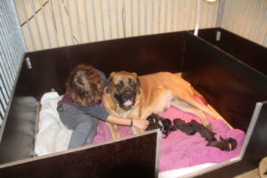 Ik denk dat ik een kwartier sliep toen Boontje met haar poezelige hoofdje over mijn hoofd zwabberde om me wakker te maken. Volledig van de wereld kijk ik direct naar de werpkist en daar zit ze. Juist Alex, in het kleine hokje waar de 9 kids ook liggen. Ze kijkt me blij en hijgend aan en ik hoor niks, helemaal niks.
